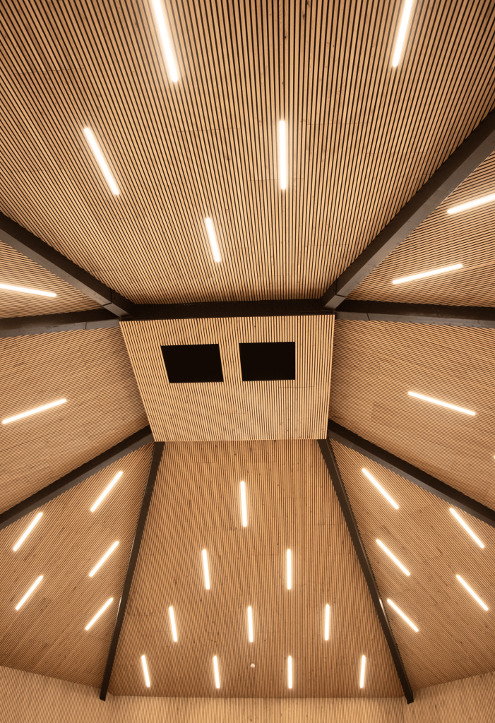 The panels are tastefully installed both on the ceiling and walls in the spacious open area, providing excellent acoustic solutions.