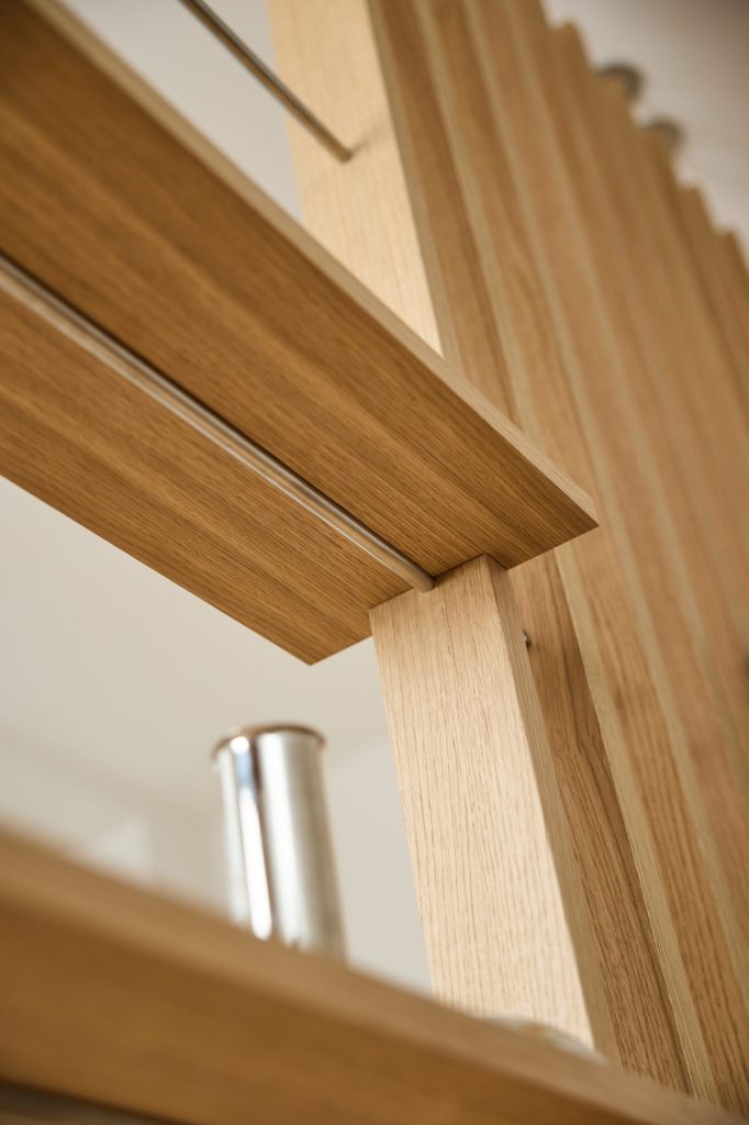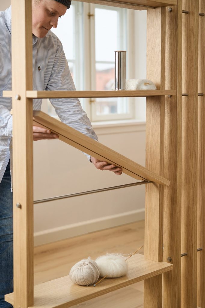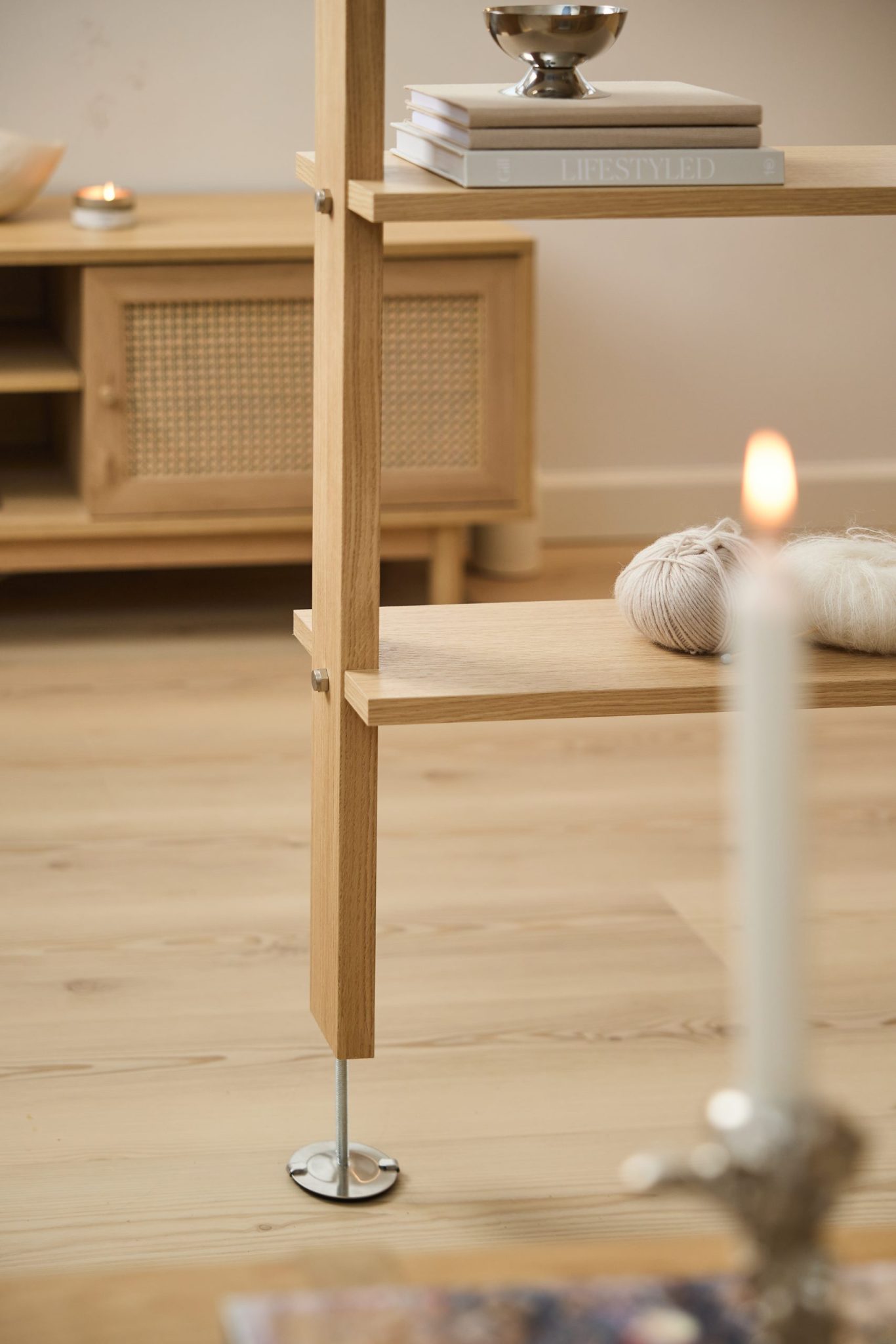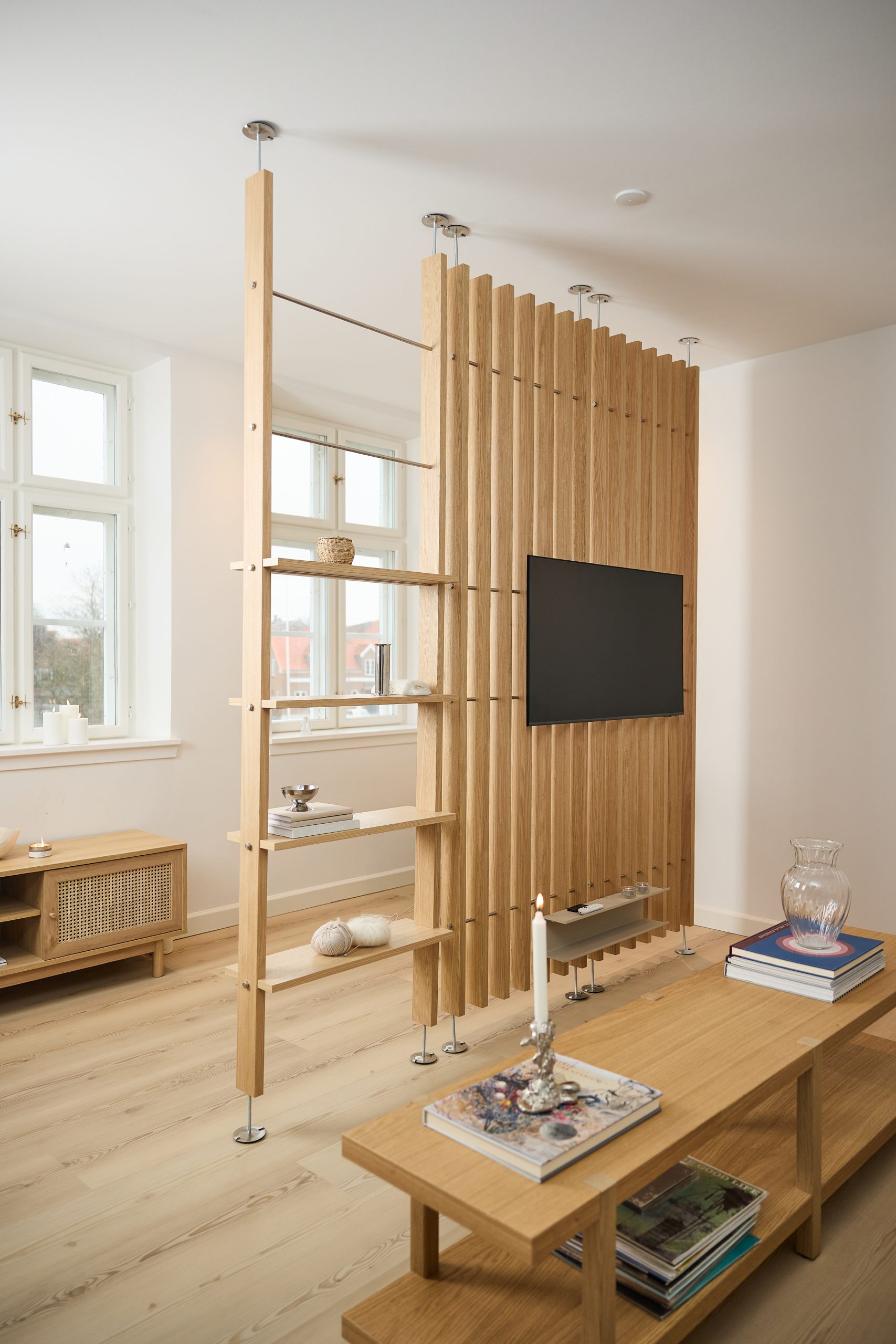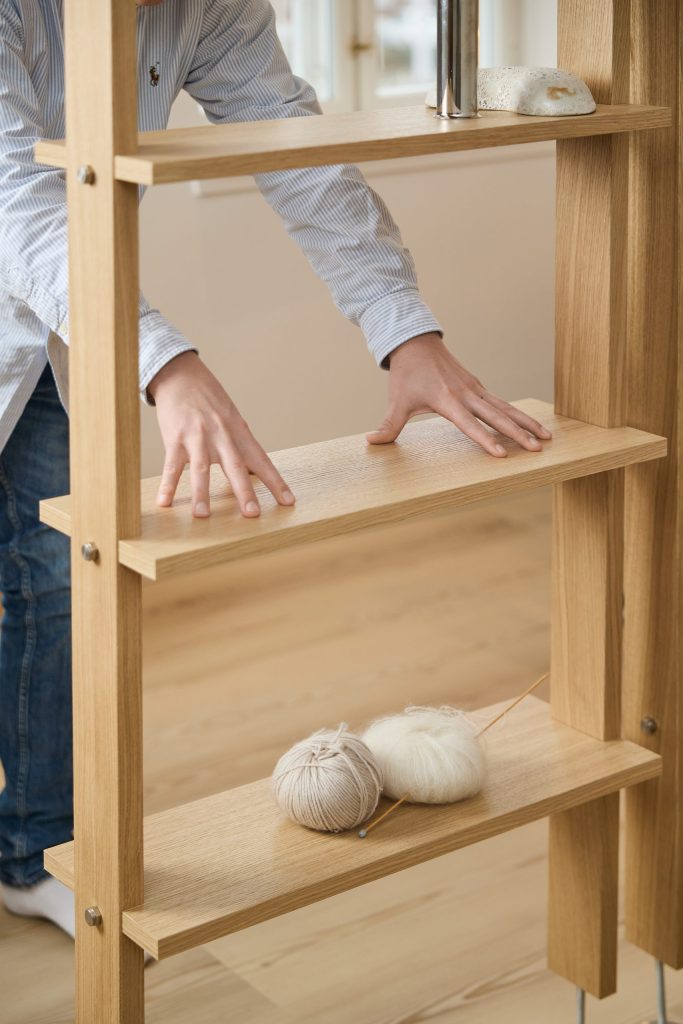 The oak shelf adds warmth and helps bring a calmer feel to the room. Natural wood softens the look of the room divider and adds a balanced, Scandinavian feel.