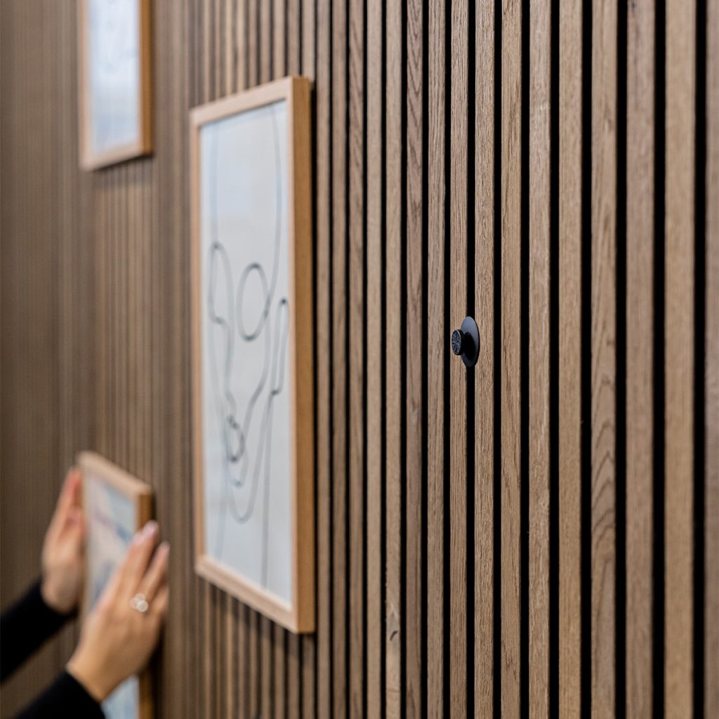 Achieve a serene, reverberation-free environment with Akupanels. They absorb and fragment sound waves, reducing stress and enhancing comfort. Attain Class A rating with mineral wool installation, the pinnacle in sound dampening. This ensures that your hallway not only looks sophisticated but also provides a comfortable acoustic environment, making farewells and greetings pleasant and stress-free.